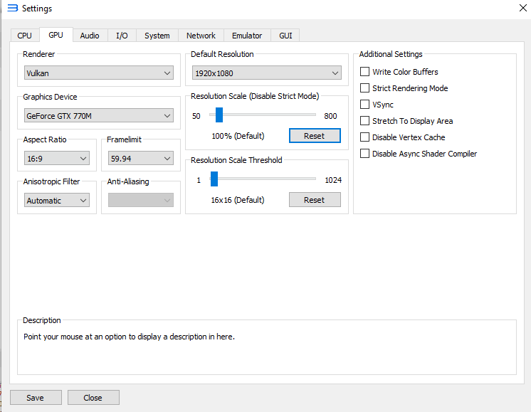 As for GPU, always go for Vulkan, and the rest are pretty self-explanatory. GPU settings won’t affect much as you are limited by your CPU’s performance. Experiment with the settings if you feel unsatisfied.